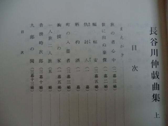 「長谷川伸戯曲全集」上・下二巻 昭和35年 新小説社発行 「非売品」と奥付にありますが、外箱には「¥2000」と引刷されています。 硫酸紙カバー、箱、外箱。23.3×12.2㎝、厚さは上下巻ともに約5㎝です。状態は、本体はきれいで、カバーには経年のヤケがありますが、箱と本体は経年を感じさせないくらいきれいです。外箱はヤケ、スレ、汚れがみられます。